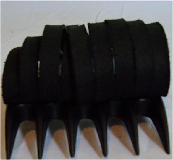 The flogger is made of genuine leather and has 16 inch long tails The claw is made of hard plastic.