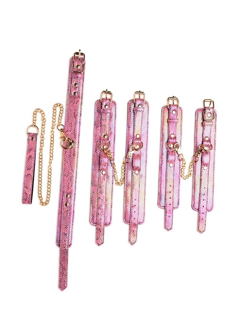 Seduce your partner with this Captive Cobra bondage set! You donb t have to wear red and black to be kinky; enjoy this seductive, serpentine set with its pink color and iridescent rainbow shine that will bring out the blushing rose in any submissive! The set comes with two wrist cuffs, two ankle cuffs, a collar and a matching chain leash. Additionally, each of the cuffs connect with short, golden chains that match the chain leash and the golden, buckle closures. Adjust for comfort with the buckles and straps. All metal is nickel-free and the vegan friendly, faux leather is made of polyurethane (PU leather). Spot clean with a soft, damp cloth.
