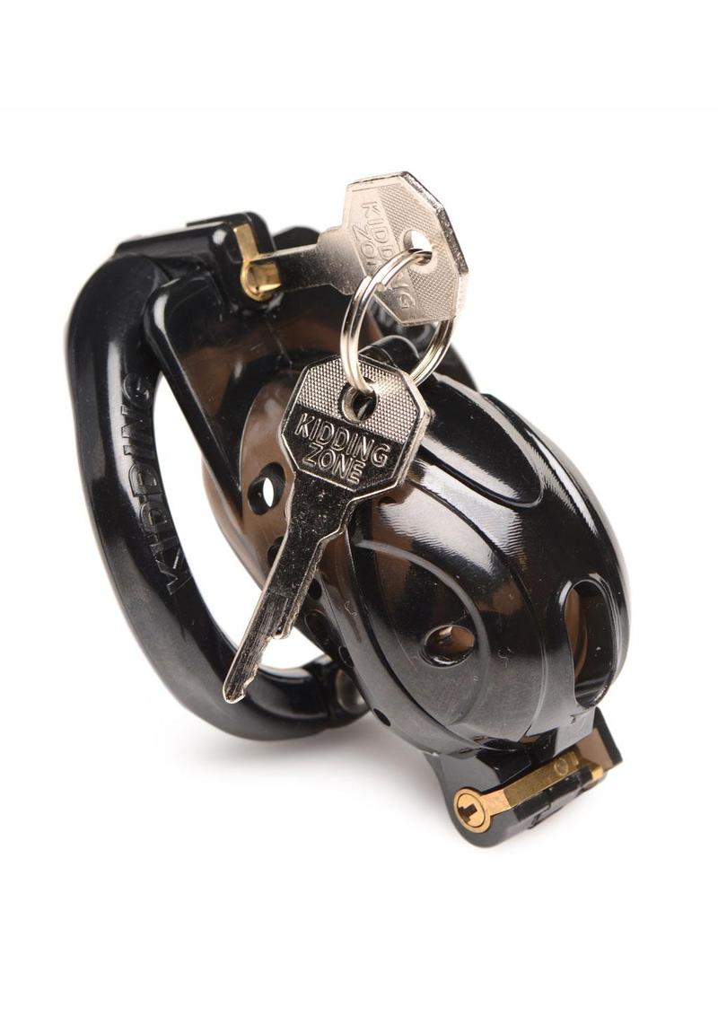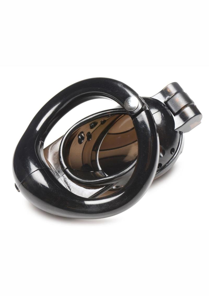 Enjoy the exciting feeling of being locked up! The smooth, hard plastic keeps your member contained and the secure locking system includes two keys and locks the cage in place without the need for a padlock to get in your way during wear. Both the wearer and the keyholder can enjoy the semi-transparent black cage and the captive member within it.