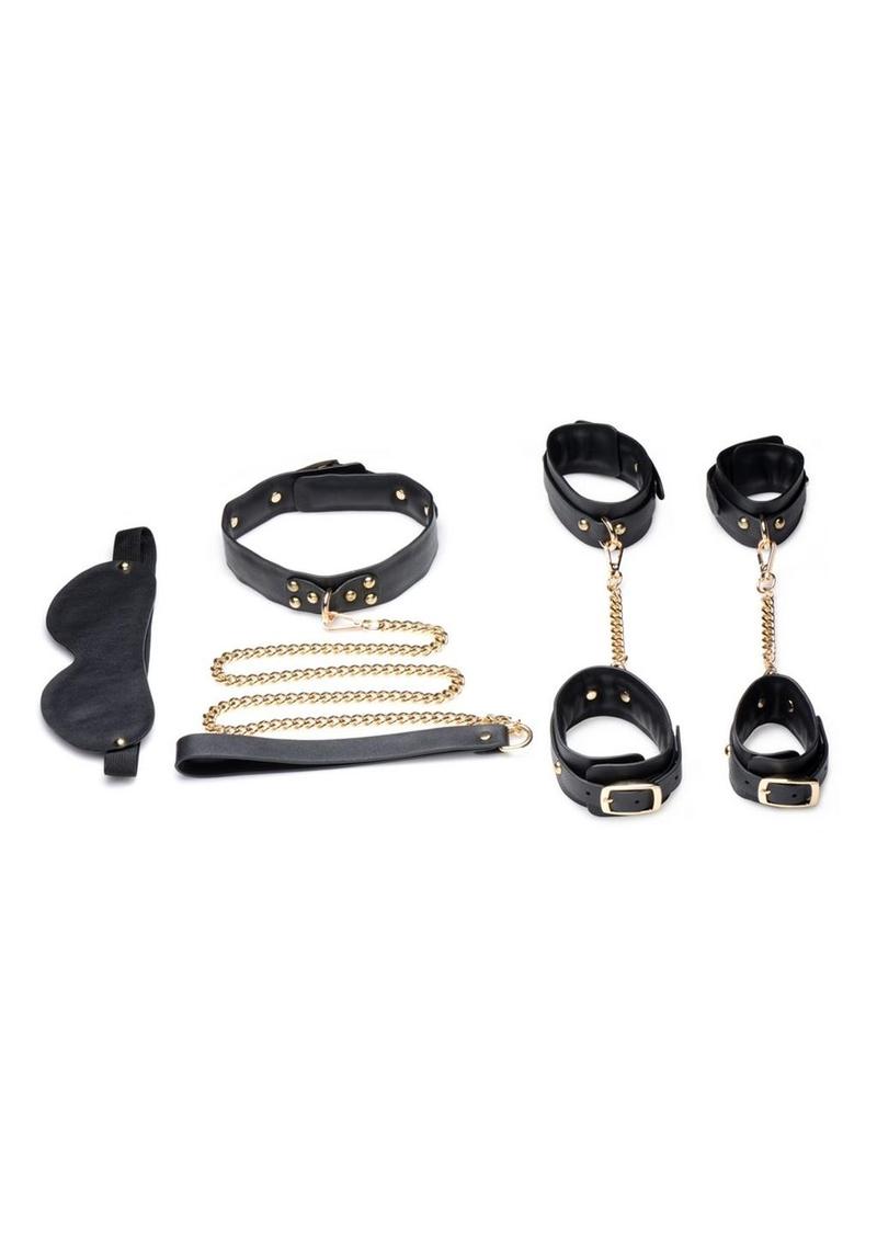 Submit and dominate in style with this regal kit of chains and cuffs! This Golden Submission kit is designed to glam up your dungeon with its golden chains, golden hardware, and sultry black PU leather cuffs and blindfold. Perfect for BDSM players with a penchant for the finer things in life but still want a set of restraints that can hold up to the usual push and pulls of bondage play!