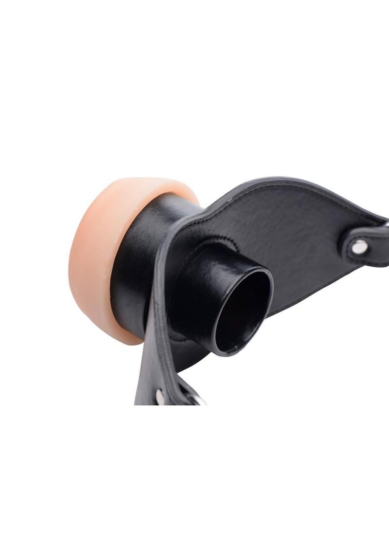 This open-mouth gag will turn your partners face into a vulva that you can thrust your shaft into! Tighten the straps around their head and secure them with the locking buckle. Push past the soft, realistic vaginal opening into your slaves eager-to-please mouth! The hard interior ring of the gag will keep their lips and teeth pried open. Enjoy humiliating your partner while they service you with this unique gag!