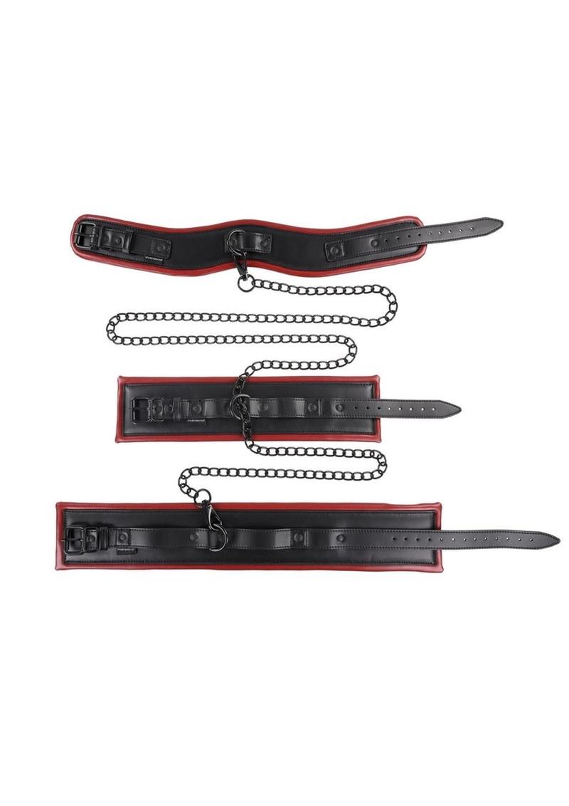 Strap them in, things are about to get hot. Enhance your next scene with the Saffron Chained & Tamed, expertly designed to keep your partner at your mercy. Use all the pieces together or interchangeably for optimum positioning. Begin your next session with the posture collar for added control. Then add the double wrist cuff to lock their hands together and the double ankle cuff to keep them in place. Next, connect the cuffs and collars how you see fit and exude your power over them.