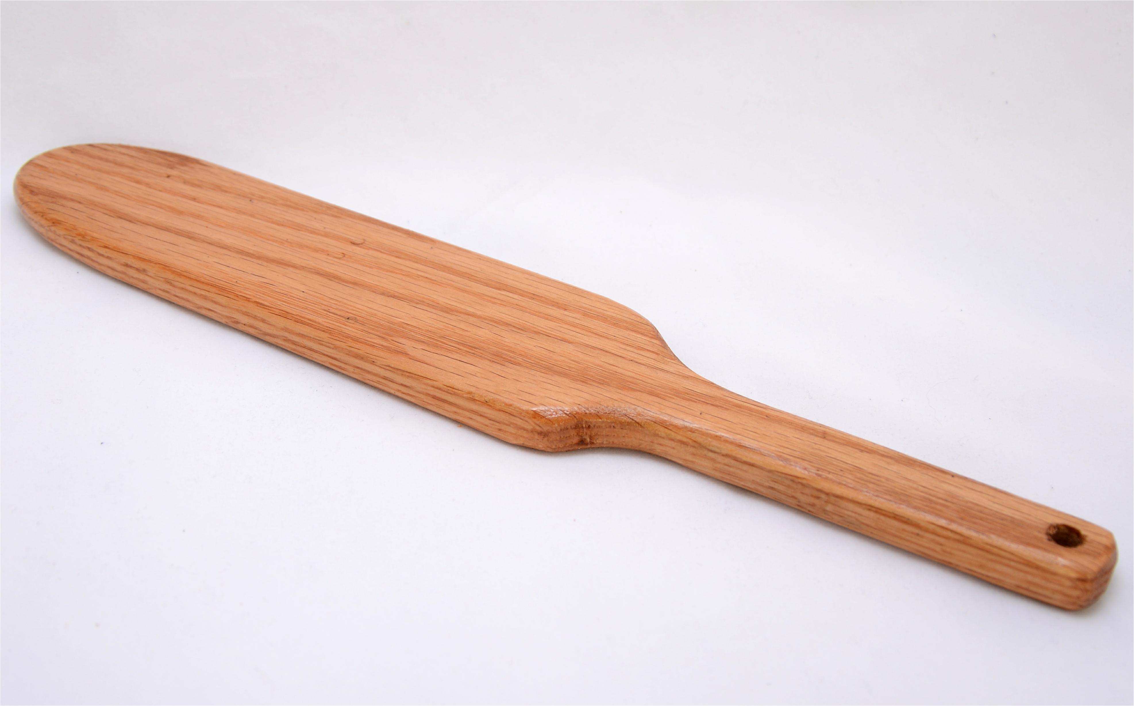 This is a very stingy type paddle. It is hand crafted of 1/2" solid oak, 12" long and 2" wide.